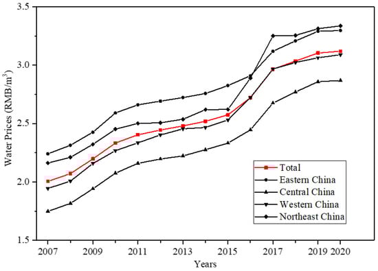 Interannual variation in yearly average domestic water prices in different regions for 2007–2020.