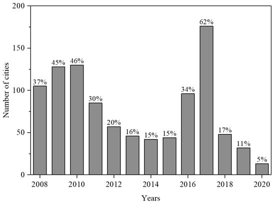 During the study period, water price adjustments were made in a total of 284 cities, with Zibo being the sole exception. Figure 4 shows the number of cities that adjusted their water prices each year. Urban residential water price adjustments were most active in 2008–2010 and 2016–2017. It can be seen that each city also actively adjusted domestic water prices to customize them more reasonably in line with the characteristics of the city. At the same time, the differences in the degree of activity of domestic water prices adjustment and the large differences in domestic water prices between cities reflect the unevenness of water price-collection standards in each region, so studying the laws of change and the factors affecting the differences is conducive to the development of better water pricing policies.