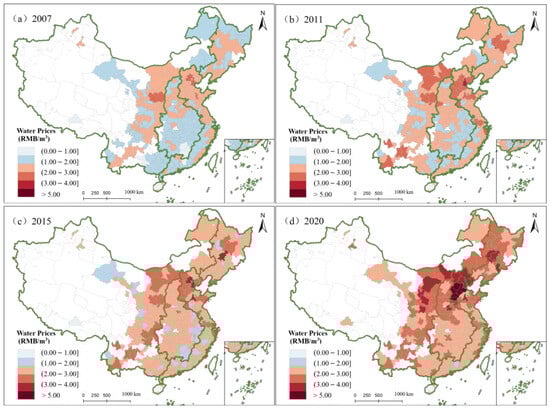 Variations in water pricing policies, water resources, and environmental conditions, as well as economic development levels across different regions, have led to significant regional disparities in China’s water pricing standards. Figure 5 shows the distribution of domestic water prices in 2007, 2011, 2015, and 2020. It shows that in 2007, the water prices in China were generally low in 2007, with only four cities (Beijing, Tianjin, Yan’an, and Zibo) having domestic water prices higher than RMB 3 per cubic meter, all of which were located in the north. However, there were still five cities (Ji’an, Baise, Heyuan, Lhasa and Anqing) whose water prices were lower than RMB 1 per cubic meter. After 2011, the majority of domestic water prices in most cities ranged from RMB 2 to 4 per cubic meter, indicating a generally low level of pricing. By 2020, the annual average water prices in the 285 cities exceeded RMB 3.12 per cubic meter. It is evident that city-level water prices generally decreased from north to south, with the top ten cities with the highest water prices in 2020 being located in northern China regions, such as Cangzhou (5.80), Baoding (5.53), Handan (5.46), Shijiazhuang (5.23), and Beijing (5.00). In contrast, municipalities characterized by lower domestic water prices were predominantly found in underdeveloped regions or areas with ample water resources, encompassing cities located in the southern, northwestern, and southwestern parts of China. The spatial distribution of domestic water prices is closely associated with regional development patterns and water resources. Overall, the price of water in northern cities is higher than that in southern cities, indicating a regional concentration phenomenon.