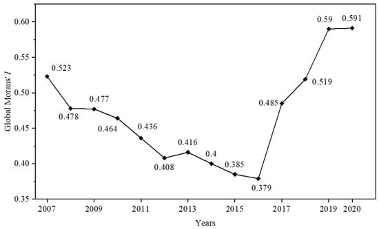 Moran’s is a statistical measure of spatial autocorrelation that evaluates whether features in a dataset are clustered or dispersed across space. It compares each feature’s attribute value with the mean attribute value of its neighboring features, taking into account both the distance between features and the strength of the correlation between them. The global Moran’s of water prices of 285 Chinese prefecture-level cities from 2007 to 2020 are shown in Figure 7, which shows that there was a significant positive spatial autocorrelation (p < 0.01) for water prices in China. It indicates that domestic water prices in a city were not only affected but also affected by surrounding cities. Regions with high domestic water prices agglomerated as did those with low domestic water prices. The global Moran’s I index exhibited significant fluctuations across a wide range of values. The positive spatial effect of domestic water prices initially decreased and then increased, indicating a statistically significant increase in the trend of spatial clustering.