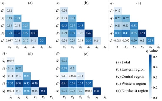 (2) The interaction detection module in geodetector determines whether there is an interaction between two factors and assesses the strength, direction, linearity, or nonlinearity of the interaction. This is performed by calculating and comparing the -values of each single factor and the -values of the two factors superimposed separately. By analyzing these values, geodetector can identify the presence and characteristics of interactions between factors [50].