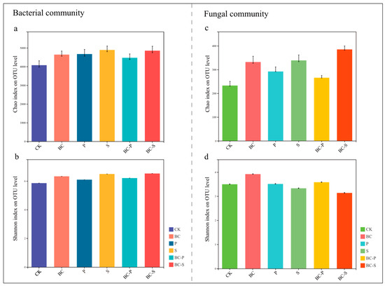 Comparative analysis of the alpha diversity of the bacterial and fungal communities in different treatments. (a) Chao index for bacterial community: the index of chao1 algorithm to estimate the number of bacterial community OTU contained in the sample. (b) Shannon index for the bacterial community. (c) Chao index for fungal community: the index of the chao1 algorithm to estimate the number of fungal community OTU contained in the sample. (d) Shannon index for the fungal community.