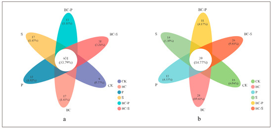 (a) Venn of soil bacterial genus level composition in the phytoremediation and biochar remediation of soil treatment; (b) Venn of soil fungal genus level composition in the phytoremediation and biochar remediation of soil treatment.