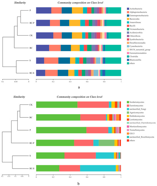 In decreasing order of abundance, the two most abundant fungal classes were sordariomycetes and eurotiomycetes. Meanwhile, there was a high abundance of unclassified classes in the S- and BC-S-treated soils (Figure 4b). The agaricomycetes were the special class in the BC-P-treated soils, while sordariomycetes were most abundant in the P-treated soils. Fungi and bacteria showed agreement on the similarity of community composition across the treatments. The fungal community composition of the S- and BC-S-treated soils was different from that of the others, which showed greater similarity.