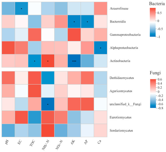 Spearman correlation heatmap of soil properties and soil bacterial (up) and fungal (down) community structures in the BC, BC-P, and BC-S treatments. * p ≤ 0.05, *** p ≤ 0.001.