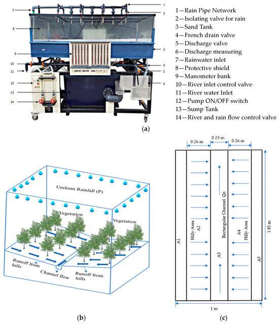 In this study, a rainfall simulator FM-1849-45 by Infinit Technologies, Rosedale, MD, USA (https://infinit-technologies.com accessed on 11 November 2023) was utilized at the University of Engineering & Technology Taxila, Pakistan’s water resources laboratory. It is a key tool for generating and measuring rainfall patterns and their impact on different hydrological processes. The equipment includes networks of pipes, 11 rainfall sprinklers, a discharge measuring weir, and control valves, as shown in (Figure 1a) with their components. These components were utilized to simulate different rainfall intensities at three different channel slopes of 0°, 1°, and 2° and to measure the corresponding runoff responses in the model.