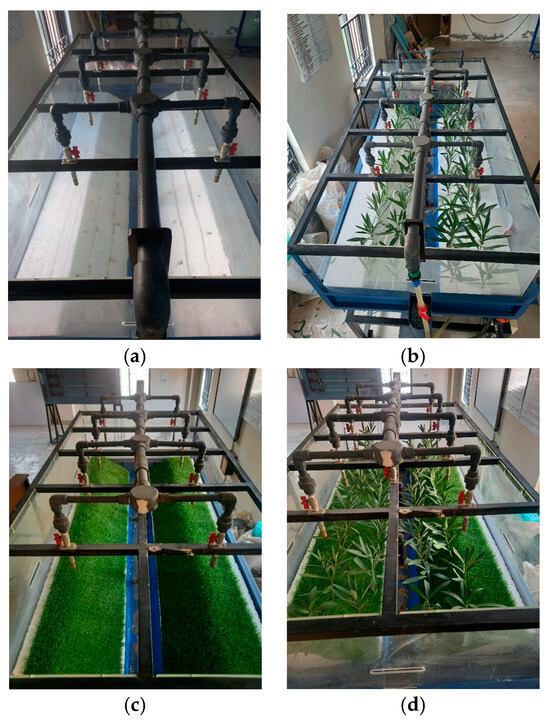 Photos of different model setups in the rainfall simulator: model without vegetation (a), model with rigid vegetation (b), model with flexible vegetation (c), and model with mixed vegetation (d).