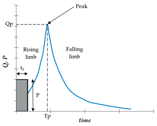 The runoff was measured using the weir installed on the downstream side of the rainfall simulator. The time-to-peak discharge (Tp) was calculated indirectly from the incrementally measured outflow data—for each unit liter, outflow time was measured with a stopwatch. The peak discharge (Qp) was measured by developing the hydrograph for each case. For each case, the rainfall simulator was run for 5 min and then switched off. After stopping the rainfall, the outflow continued through the catchment, producing different outflow hydrographs for each case, depending upon the land use conditions, the rainfall intensity, and the channel slope. The outflow hydrograph was simplified into three main components—rising limb, peak, and falling limb, as shown in Figure 3—and all the cases used in the experiments are presented in Table 1.