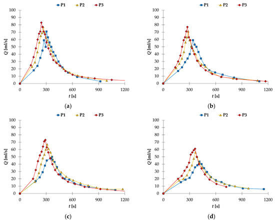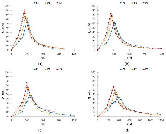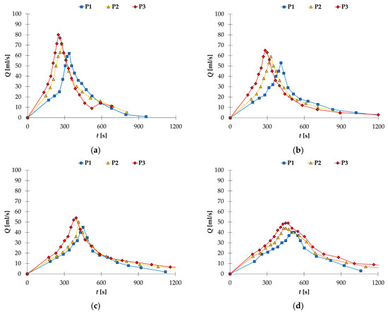 Outflow hydrographs for channel slope of 1° for: no vegetation condition (a), rigid vegetation condition (b), flexible vegetation condition (c), and mixed vegetation condition (d).