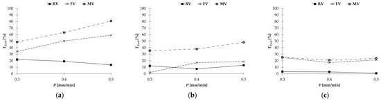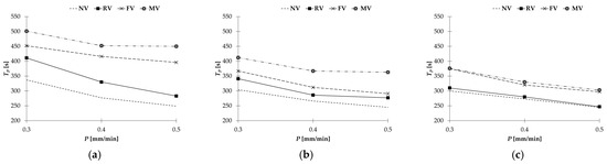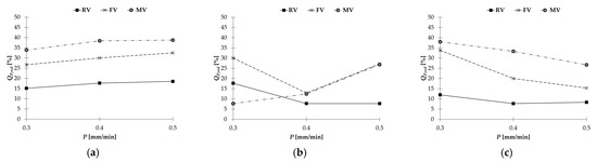 Time-to-peak discharge is the key factor in defining the time for the community to respond to a flood [30,31]. The Tp for all experiments decreased with the increase in the rainfall intensity, emphasizing the fact that the rainfall duration was shorter than the catchment concentration time (Table 4 and Table 5). Similar to the Qp analysis, the Tp increased from RV, over FV to MV, revealing that MV contributes the most to both the decrease in Qp and increase in Tp, which when combined, reduced the flood risk. The MV case at slope 0° under rainfall intensity P3 showed the maximum resistance to the flow, followed by the FV and RV cases.