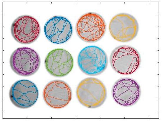 The algorithm multiwellTracker [36] was adapted by the team for the analysis of the behaviour videos recorded with the above video-tracking system. The adaptation included the automatic detection of the circular arenas, tracking and analysis of the trajectories, as well as validation and extraction of nine behaviour parameters: distance covered (derived from the Y and X coordinates, i.e., the position of the organism in the Y and X axes); mean velocity (mm/s); mean angular velocity (degrees/s); the degree formed by movement vectors; instantaneous velocity (mm/s); the square root of the standard deviations of X and Y (dispersion measure); and the mean meander (degrees/mm) and instantaneous acceleration (mm/s2). The adapted algorithm ran through three phases, each responsible for different but equally important steps in making the video easier to analyse. It worked by differential brightness between the organism of interest and the background i.e., it followed a dark object in a bright background. The first phase (pre-processing) corrected various aspects of the provided video. Here, possible fishbowl effects were removed, diminishing the distortion observed in the extremities. Furthermore, the contrast between the object and background was increased, making it an almost black-and-white image. The second phase was the detection of the trajectory, where the algorithm detected the number of circular arenas, delimited them and then detected the trajectories created by the moving organisms. This tracking was done through the variation in colour intensity in each frame. This approach requires a stable zoom and camera position while recording, and a suitable lighting orientation to ensure the best possible contrast between the background and the organism. The last phase was post-processing. Here, the detected trajectories were analysed and the behaviour parameters were derived from them. The obtained data were exported as Excel files. Additionally, a verification file was created, which allowed us to check the detection of the arenas and trajectories for the validation of the data obtained (Figure 1).