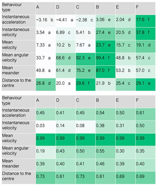 Characteristics of the behaviour types defined by the Cluster Analysis based on the Artificial Neural Network. (Top) Mean values in each behaviour type of the most relevant movement parameters. Significant differences among types were identified for the parameters investigated; homogenous subsets identified through the Scheffé test are indicated by small letters (different letters indicate significant differences at p < 0.05). (Bottom) Contribution (weight) of each movement parameter to the different behaviour types. The darker the green shade, the stronger the contribution. The results are grouped according to similarities in behavioural types across toxicants as found through cluster analysis.