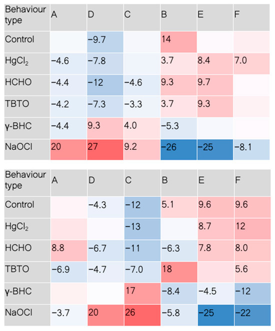 Results of the residual analysis conducted to identify significant differences among treatments (control; formaldehyde, HCHO; tributyltin, TBTO; mercury, HgCl2; lindane, γ-BHC; sodium hypochlorite, NaOCl) in juvenile (top) and mature (bottom) triops. Only the significant residuals are shown; the statistical significance of each residual was determined by comparing the respective partial Chi-square value against the critical distribution value estimated with the Bonferroni correction for a significance level of 0.05.