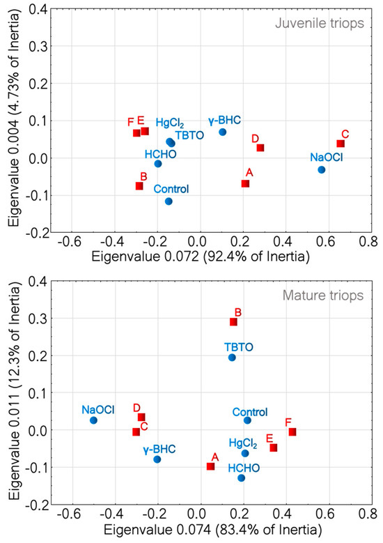 The Chi-square analysis identified significant differences among the experimental conditions in the exposure of both juveniles (Chi2 = 3753, df = 25, p < 0.0001) and mature animals (Chi2 = 4453, df = 25, p < 0.0001). Figure 3 shows the residuals of the analysis and their statistical significance as determined by comparing each partial Chi-square value with the critical distribution value corresponding to a 0.05 significance level corrected by the Bonferroni method. From these results, behavioural profiles can be drawn for each experimental condition and used to distinguish the toxicants from the control, as indicated also by a Correspondence Analysis (Figure 4). Juvenile controls (7-d-old triops) tended to exhibit mostly the behaviour type B (swimming fast, with quick rotations, in the centre of the arena) (Figure 3 and Figure 4). Mature controls (14-d-old triops) tended to show a lower frequency of behaviour C and increased frequencies of behaviour types E and F (intermediate mean velocity and swimming away from the centre of the arena). As for the toxicants, triops were sensitive to all toxicants and two main responses were found; toxicants with increased frequencies of behaviour types C and D (lindane and bleach) and toxicants with increased frequencies of behaviour types E and F (mercury, formaldehyde and tributyltin). Sodium hypochlorite elicited the strongest changes, suggesting triops were particularly sensitive to it, as found previously for other species [26,35]. Juvenile and mature triops responded in a fairly similar way to NaOCl. At 7 d of age, the exposure tended to markedly increase the frequency of behaviours A, D and C, and decrease the frequency of behaviour types B, E and F, compared to expected values and the remaining treatments. At 14 d of age, the exposure tended to decrease the frequency of behaviour types A, B, E and F, and increase the frequency of behaviour types C and D. Globally, triops exposed to bleach were the slowest and less erratic (as indicated by the instantaneous acceleration) swimmers, as observed in zebrafish [26,35]. This tendency for slow wandering swimming may be related to the cellular depletion of ATP (adenosine triphosphate) elicited by the exposure [37], which may limit the energy available for locomotion. Exposure to lindane also tended to slow down the animals, at both 7 and 14 days of age, as reflected by the significant increase in the frequency of behaviour types D and C (Figure 3 and Figure 4) and decrease in behaviours B, E and F. Lindane is known to be neurotoxic through its interaction with glycine receptors, which are major inhibitory receptors in the spinal cord and the brain stem [38]. In contrast, TBTO tended to elicit fast swimming responses. The exposure caused marked differences from the control profile, notably decreasing the frequency of behaviour types A, D and C and increasing the frequency of behaviour types B and E in 7 d-old triops and B and F in 14 d-old animals; the latter are the behaviours showing a higher mean velocity. Tributyltin is a ligand of retinoid X (RXR) and the ecdysteroid (EcR) receptors, which, in arthropods, act as homologs of RXR. Furthermore, it is a well-recognised endocrine disrupter that causes neurotoxicity and physiological stress in exposed animals [39]. While little is known about the mechanistic effects of tributyltin in T. longicaudatus, the recent protein-ligand modelling of EcR revealed the great evolutionary conservation of the protein across species when comparing the interaction amino acids (ascribed to RXR in Homo sapiens), with little conformational variation in the interaction pocket [40]. Exposure to formaldehyde tended to increase the frequency of behaviours B and E in 7 d-old triops, and A, E and F in 14 d-old triops, although at more moderate levels, and in opposition to the changes observed in the bleach group. Globally, the animals tended to show very irregular swimming in the periphery, with interspersed periods of lower and higher mean velocity, particularly at 14 d of age (Figure 3 and Figure 4). Formaldehyde was previously found to alter the behaviour and respiration (time-dependent decrease in oxygen consumption) of zebrafish, with the detection of abnormal swimming movements, reduced opercular beats and increased mucus secretion that may be lethal [41]. These alterations were linked to increased metabolic costs due to damage in the gills, impairing movement ability. The response to mercury chloride was very similar to that observed in the formaldehyde-exposed group, except for behaviour type F, which also tended to be increased in frequency in juvenile triops. Mercury is a known neurotoxicant affecting the brain, but also possibly the central and peripheral nervous system [42].
