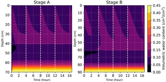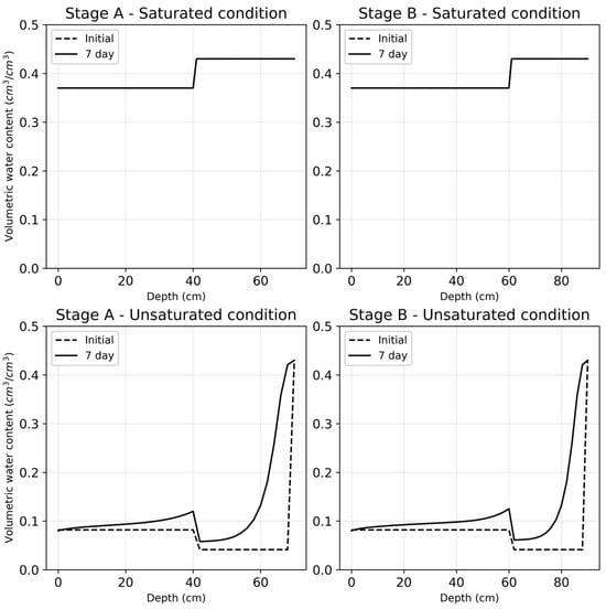 The four graph plots describe the simulated water flow patterns in stages A and B at different depths of the substrate bed under saturated and unsaturated conditions. The two plots at the top illustrate the water content under saturated conditions, while the bottom two graphs illustrate the water content under unsaturated conditions.