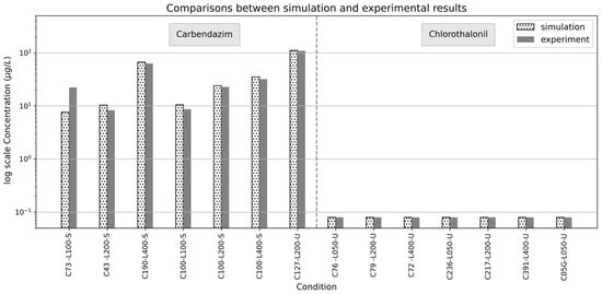 For carbendazim, the default Kd value was set at 0.58, and the default Ks value was set to 7 × 10−7. The mass transfer resistance factor was set to 0.2 for HLR of 100 L d−1, while it was set to 1 for HLR of 200 and 400 L d−1. The degradation enhancement factor was set at 1 for HLR of 100 L d−1, while it was set at 45 and 90 for HLRs of 200 and 400 L d−1, respectively. For chlorothalonil, the default Kd value was set at 6.5, and the default Ks value was set to 1 × 10−6. The mass transfer resistance factor was set to 0.4 and 0.6 for HLRs of 50 and 200 L d−1, respectively, while it was set to 1 for HLR of 400 L d−1. The degradation enhancement factor was set at 1 for all three HLRs of 50, 200 and 400 L d−1. Note that calibration was not performed for cases for HLR of 400 L d−1 for chlorothalonil so they were excluded from the table. A comparison of the calibrated simulation data with experimental data is illustrated in Figure 3, while a detailed summary of the factor values and errors can be found in Table S3.