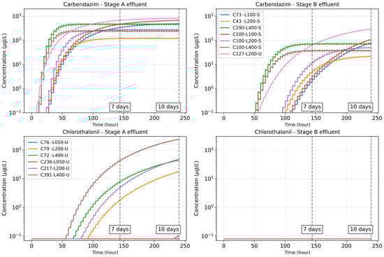 Illustration of pesticide effluent concentration data over a period of 10 days. Each individual line represents a particular simulation case. The colored lines for Carbendazim—Stage A effluent correspond with those of Carbendazim—Stage B effluent.