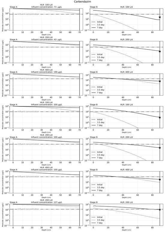 Solute transport results for the seven simulation cases used for carbendazim after 7 days of operation. The seven cases depicted in the figure correspond to findings from previous experimental work with carbendazim. The star in the graph for stage B indicates the effluent concentrations observed from experimental work.