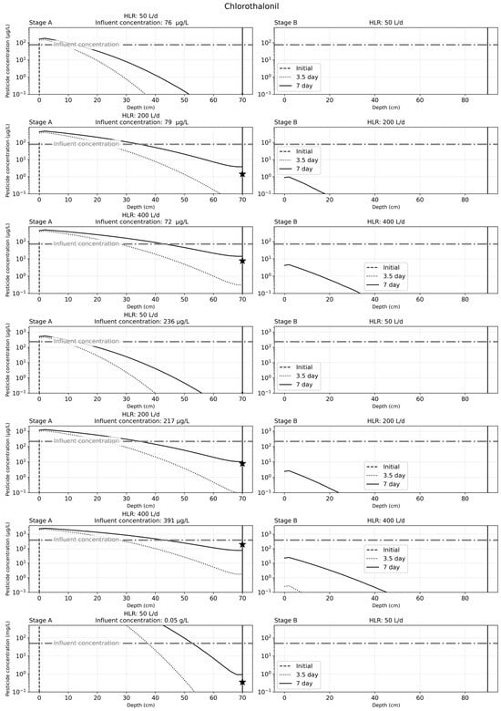 Solute transport results for the seven simulation cases used for chlorothalonil after 7 days of operation. The seven cases depicted in the figure correspond to findings from previous experimental work with chlorothalonil. The star in the graph for stage A indicates the effluent concentrations observed from experimental work.