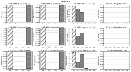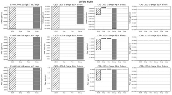 Figure 7 and Figure 8 illustrate the contribution of different processes for selected cases (the other cases were omitted, since the results were fundamentally the same), just before and after a system flush. The process contributions were compared with the net decrease or increase in pesticide concentrations at a certain time point (characterized as dC/dt), which indicates the concentration change at a given time (i.e., 2, 4, 7 days). The negative dC/dt values indicate a net pesticide removal, while positive dC/dt values indicate a net pesticide accumulation. The removal or accumulation rate was balanced by considered processes.