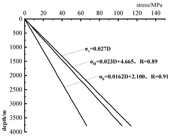 The initial state of the model is established before starting the numerical simulation, including the initial temperature, initial pore water pressure, and initial formation stress. The temperature gradient is determined according to the research results of Yu Qiang et al. [31] set to the Ordos area: T = 0.029H + 10.86; The pore water pressure is set to 10 MPa/km (Figure 2) according to the hydrostatic pressure gradient. and the initial geopathic stress is determined with reference to the stress gradient assumed in the study by Bai Lin [32] for geological CO2 disposal at the Ordos site.