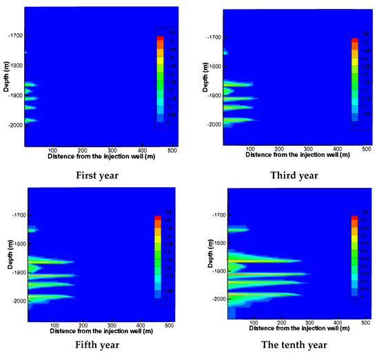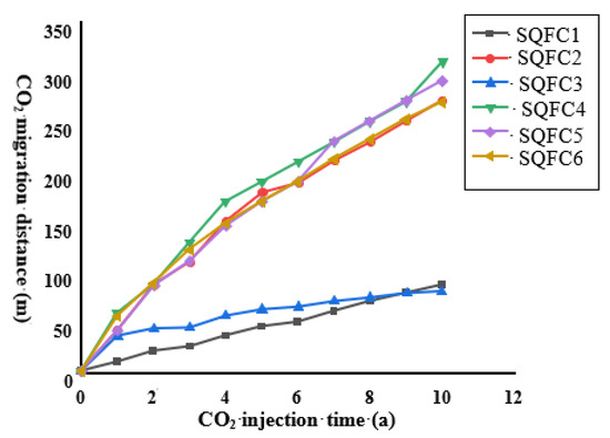 Figure 4 shows the relationship between the migration distance of CO2 in each reservoir over time. It can be seen that the CO2 migration distance in two reservoirs, SQFC1 and SQFC3, is the shortest, and the migration distances of the other four reservoirs are relatively close to each other. In other reservoir-overburden combination formations, the maximum migration distance of CO2 is 62.45 m after one year of injection or 286.68 m after ten years of injection.