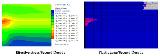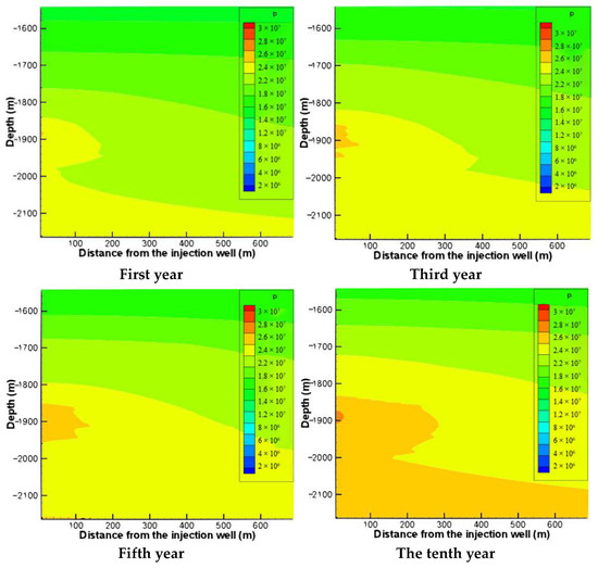 After CO2 is injected into the target underground reservoir, the increase in pore pressure leads to a decrease in effective stress, and when the pore pressure increases to a certain extent, the reservoir rock will be damaged, which is reflected in the simulation results as the appearance of plastic zones. In the model of this work, the pore water pressure increases within ten years of simulation, which is not enough to cause damage to the formation. The simulation time continues to increase and after 20 years of simulating continuous injection, the formation begins to experience shear damage. Figure 8 shows the distribution of plastic zones simulated by our model by years of CO2 injection. According to the plastic evolution trend shown in the figure, the decrease in effective stress corresponds to the change rule of plastic zone expansion. Due to the different permeability and thickness of the reservoir and cover layer between individual layers, the pore fluid pressure increases to different extents at different locations and therefore the damage to the rock is different at different depths.