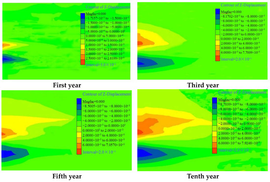 Comparing Figure 5 and Figure 6, it can be seen that the area and magnitude of the total deformation of the formation is positively correlated with the magnitude and range of the increase in pore pressure, with the increase in the injection volume, which leads to the size and range of the pore fluid pressure in the combined area of the reservoir overburden increases from year to year, and the magnitude and range of deformation of the formation near the injection point also gradually increases. According to the simulation results, the maximum vertical deformation of the formation under this injection condition is on the order of millimeters. The area of influence gradually extends from initially a few hundred meters to a few thousand meters. Comparing the results of Jonny’s study on the surface displacement of the Insalah geological CO2 storage site [33], the simulation results in this paper are within a reasonable range given the difference between the injection volume and the pore pressure variation.
