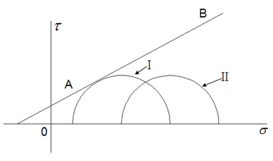 Effect of pore pressure on rock damage (Moore envelope in AB) [25]. I: Mohr’s circle of effective stress; II: Mohr’s circle of non-porous fluid pressure.
