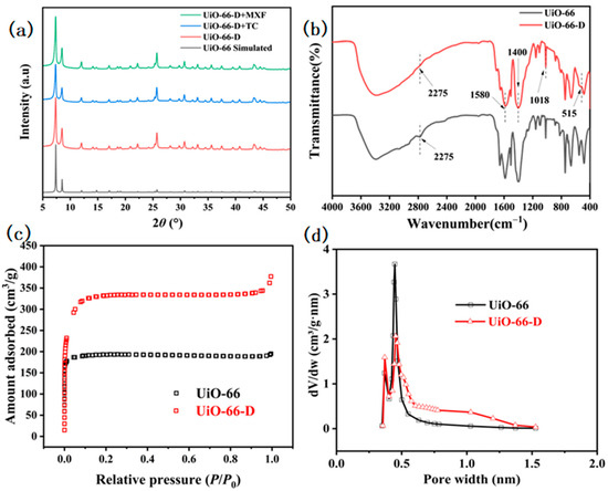 (a) XRD patterns of UiO-66, UiO-66-D, and UiO-66-D after detection of TC and MXF; (b) FTIR spectra of UiO-66 and UiO-66-D; (c) nitrogen adsorption and desorption isotherms of UiO-66 and UiO-66-D; (d) pore size distributions of UiO-66-and UiO-66-D.