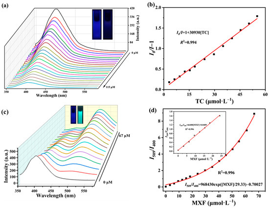 Furthermore, the fluorescence detection performance of UiO-66-D towards TC and MXF with various concentrations was studied. As shown in Figure 3a, with the increased addition of TC from 0 to 115 μM, the emission intensity at 400 nm under 320 nm excitation was decreased, and the quenching efficiency reached 87%, which is higher than that of UiO-66 (Table S1). Moreover, the color of the emission under UV light changed from bright blue to dark blue (Figure 3a inset). The relationship between the emission intensity at 400 nm and the TC concentration at 0–115 μM had a good, linear Stern–Volmer (S-V) relationship [31] (Equation (1)) (Figure 3b). The Ksv value of TC was 3.093 × 104 M−1 and the correlation coefficient (R2) was 0.994.