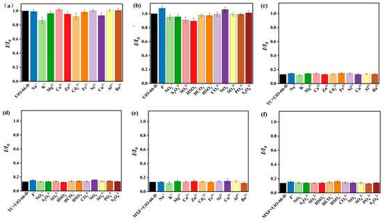 Selectivity and anti-interference are crucial factors in assessing the applicability of sensors. Therefore, we investigated the selectivity and anti-interference capabilities of UiO-66-D towards TC and MXF sensing. As shown in Figure 4a,b, compared to the fluorescence signals obtained in the existence of other common ions in water, there was a decrease or change in emission intensity only when TC or MXF was present, indicating high selectivity towards TC and MXF sensing by UiO-66-D. Furthermore, when TC or MXF co-existed with other common ions in water, changes in fluorescence were consistent with those observed when only TC or MXF were present (Figure 4c–f), confirming that common anions and cations did not interfere with the detection process for TC or MXF.