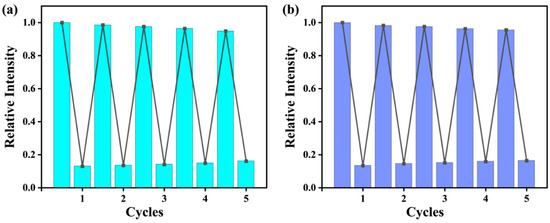 Recyclability is another key factor in evaluating the performance of sensors in practical applications. Therefore, five-cycle experiments were taken to evaluate the recyclability of UiO-66-D in TC and MXF sensing. As described in Figure 5a,b, both the initial emission intensity and quenching percentage for TC sensing or the fluorescence ratio for the MXF sensing of UiO-66-D did not change significantly after five cycles, demonstrating good sensing performance stability and good reuse performance.