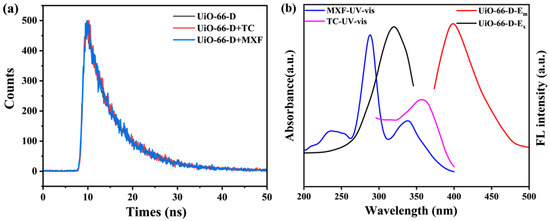The response mechanism of UiO-66-D for TC and MXF sensing was further studied by testing and analyzing the structure of the materials before and after detection, as well as the UV-vis absorption spectrum, fluorescence spectrum, and fluorescence lifetime. As seen in Figure 1a, UiO-66-D retained its original crystalline structure after the detection of TC and MXF, thereby indicating that the alteration in the fluorescent signal was not attributed to structural damage. The fluorescence lifetime of UiO-66-D before and after the detection of TC and MXF in aqueous solution was further studied. As shown in Figure 6a, the average fluorescence lifetime of UiO-66-D in water was measured as 6.91 ns. Subsequent to the detection of TC and MXF, the average fluorescence lifetime was 7.29 ns and 7.01 ns, respectively, exhibiting a difference within one order of magnitude from pre-detection values, rendering this change. During the sensing process, if there is an occurrence of fluorescence resonance energy transfer (FRET), then significant reduction would be observed in the fluorescence lifetime post-detection. However, it can be inferred from this experiment that there is almost no change between the pre- and post-detection fluorescence lifetimes, suggesting that the quenching process is static, with FRET not being the primary cause for the modulation of the fluorescence signal; instead, an inner filter effect (IFE) may occur. Furthermore, additional testing revealed non-overlapping UV-vis absorption spectra for both TC and MXF with emission spectra of UiO-66-D, but overlapping excitation spectra (Figure 6b), confirming the occurrence of IFEs for fluorescence quenching by UiO-66-D. Moreover, regarding MXF sensing specifically, it should be noted that the peak at 509 nm originates from MXF itself (Figure S6), wherein the increase in intensity corresponds to elevated concentration levels of MXF.