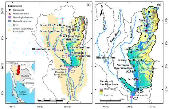 Geographical illustration of Thailand’s extensive Chao Phraya River Basin: (a) the Nan River watershed highlighting the positions of major dams within the Chao Phraya River network; (b) sites of hydrological monitoring managed by the Royal Irrigation Department (RID) and the observation sites in this study.