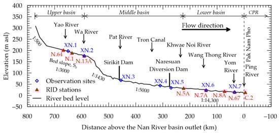 Profile view of the Nan River detailing the positions of RID hydrological monitoring stations (indicated by red triangles) and sites of field observations (marked with blue diamonds). The zero mark on the x-axis represents the confluence of the Ping and Nan rivers.