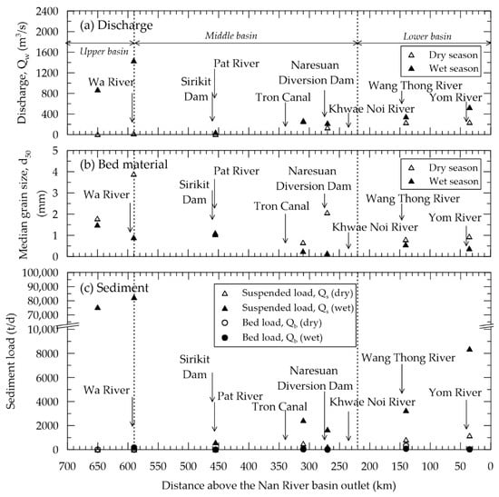- Namsai, M.; Mama, R.; Sirapojanakul, S.; Chanyotha, S.; Phanomphongphaisan, N.; Bidorn, B. The characteristics of sediment transport in the upper and middle Yom River, Thailand. In Proceedings of the THA 2019 International Conference on Water Management and Climate Change towards Asia’s Water-Energy-Food Nexus and SDGs, Bangkok, Thailand, 23–25 January 2019; Water Resources System Research Unit, Chulalongkorn University: Bangkok, Thailand, 2019; pp. 346–352. [Google Scholar]