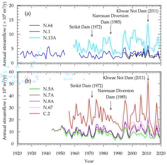 Table 3 shows that the annual streamflow in the upper basin (N.64, N.1, and N.13A) varied from 1.34–13.83 × 109 m3/y without a significant increasing or decreasing trend. In contrast, annual runoff in the middle basin (N.5A) ranged 3.20–15.55 × 109 m3/y with a significant decreasing trend. The annual river discharges in the lower basin varied from 4.00 to 22.72 × 109 m3/y with no significant trend at N.7A and N.8A, but the statistic decreasing trend was found at N.67 near the Nan basin outlet. The annual streamflow at C.2 in the CPR ranged 7.30–56.68 × 109 m3/y without a statistical trend (p-values > 0.05). The results also revealed that the significantly higher discharges found at all stations occurred during flood events, such as in 1995, 2002, 2006, 2011, and 2017 (Figure 4).