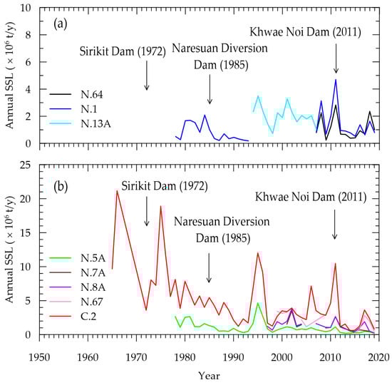 The spatial variation analysis of annual TSL revealed that the average long-term annual TSLs at N.64, N.1, N.13A, N.5A, N.7A, N.8A, N.67, and C.2 were 1.155, 1.158, 1.400, 1.669, 1.476, 1.372, 1.875, and 4.825 × 106 t/y, respectively (Table 3). Unlike the annual river discharge, the average annual TSLs after the dams’ building fluctuated along the river. In the river upstream of the Sirikit Dam, the average sediment load of all time periods (1964–1971, 1972–1984, 1985–2010, and 2011–2019) increased upstream to downstream (Figure 6b). Meanwhile, the average annual TSLs downstream of the Sirikit Dam rose along the river (Figure 6b). However, the average yearly TSL of N.7A was greater than N.8A after the construction of the Naresuan Dam in 1985. Additionally, the average annual sediment load of all time periods significantly climbed at C.2 (Figure 6b). Based on Figure 6b, prior to the construction of the Sirikit and Naresuan dams, there was an observed increase in the average annual sediment load along the river from the upper to the lower reaches. The data reveal that the average annual TSLs at N.1 and N.13A, located upstream of the Sirikit Dam, were higher during 1972–2019 compared to the pre-dam construction period of 1964–1971. Furthermore, post-construction observations indicate a significant reduction in the average annual TSL at N.5A: a 30% decrease following the construction of the Sirikit Dam (1972–1984), a 57% decrease post-Naresuan Dam (1985–2010), and an 83% decrease following the Khwae Noi Dam (2011–2019). Conversely, the average annual TSL at Station C.2 exhibited an initial increase of 17% during 1972–1984, followed by reductions of 40% and 61% in the periods of 1985–2010 and 2010–2019, respectively. The sediment data reveals that the average annual TSL at N.67 between 1998 and 2019 accounted for 70% of the C.2 (Figure 7).