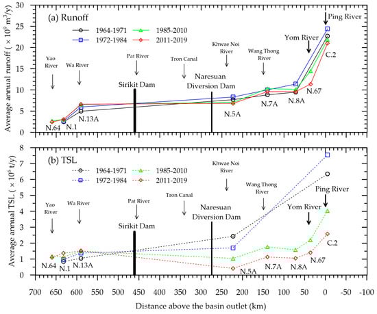 Results from statistical analysis and MK tests on long-term annual streamflow and annual TSL data measured during 1922–2019 are summarized in Table 3. Figure 6 depicts annual streamflow and TSL averaged over the considered periods, such as 1964–1971 (pre-construction of the Sirikit Dam), 1972–1984 (post-construction of the Sirikit Dam and pre-construction of the Naresuan Dam), 1985–2010 (post-construction of the Naresuan Dam and pre-construction of the Khwae Noi Dam), and 2011–2019 (post-construction of the Khwae Noi Dam).