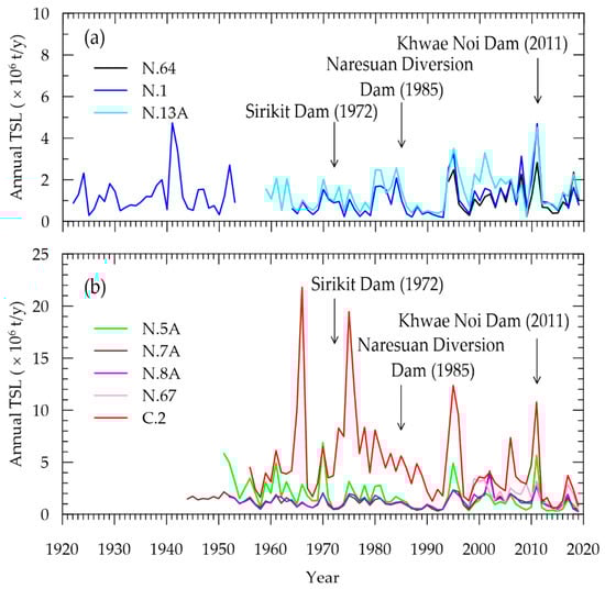 The combination of SSL and BL constitutes the TSL carried by the Nan River. Assessing the variation in sediment load along the river, especially considering the impact of dam construction on sediment dynamics and contributions to the CPR system, involved estimating the TSL at each hydrological station. Due to the sporadic availability of SSL data, which was limited in both time and location, the relationship between river discharge and SSL at each station (as per Equations (8)–(17)) was applied to estimate the gaps in daily SSL data over the past decades. Subsequently, BL was inferred from these SSL estimations using the BL-to-SSL ratios derived from field surveys. For this analysis, long-term BLs at N.5A, N.7A, N.8A, and N.67 were approximated using ratios of 0.05, 0.20, 0.20, and 0.01, respectively. In the upper basin (N.64, N.1, and N.13A), BL was found to be negligible (~0). Additionally, a BL to SSL ratio of 0.03, as reported by Bidorn et al. [], was used for estimating BL at C.2. Figure 7 presents the estimated annual TSL for the upper, middle, and lower reaches of the Nan River over the period of 1922–2019. Table 3 includes a summary of the basic statistical and trend analysis results for the annual TSL data.