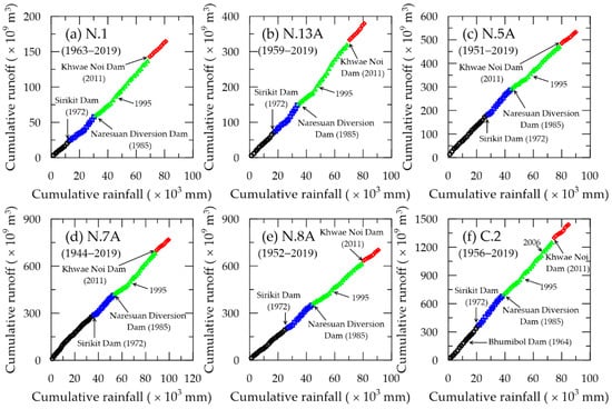 Double-mass curves of annual rainfall and river runoff on the Nan River: (a) at N.1; (b) at N.13A; (c) at N.5A; (d) at N.7A; (e) at N.8A; (f) at C.2. The colored points indicate various periods: black for before the construction of the Sirikit Dam, blue for before the construction of the Naresuan diversion dam, green for before the construction of the Khwae Noi Dam, and red for after the construction of the Khwae Noi Dam.