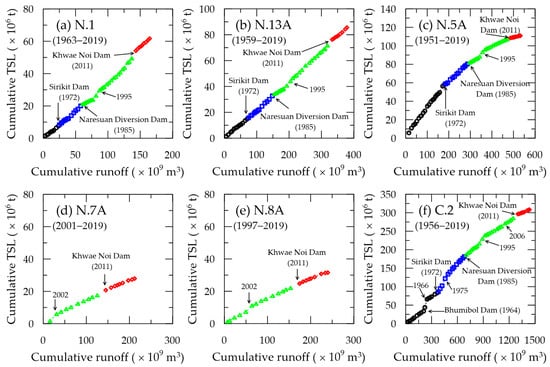 Double-mass curves of annual runoff and total sediment load (TSL) on the Nan River: (a) at N.1; (b) at N.13A; (c) at N.5A; (d) at N.7A; (e) at N.8A; (f) at C.2. The color coding indicates different phases: black for the period before the Sirikit Dam construction, blue for before the Naresuan diversion dam construction, green for before the Khwae Noi Dam construction, and red for after the Khwae Noi Dam was built.
