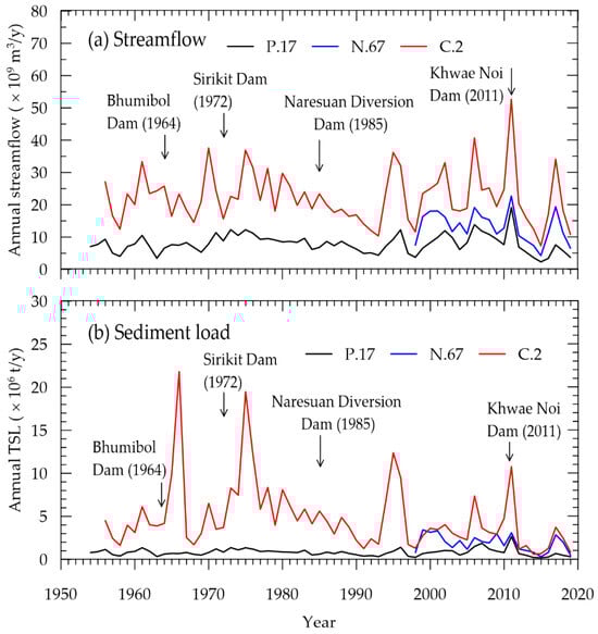 Chronological sequence of (a) annual streamflow and (b) annual TSL at RID Stations P.17, N.67, and C.2 from 1954 to 2019.