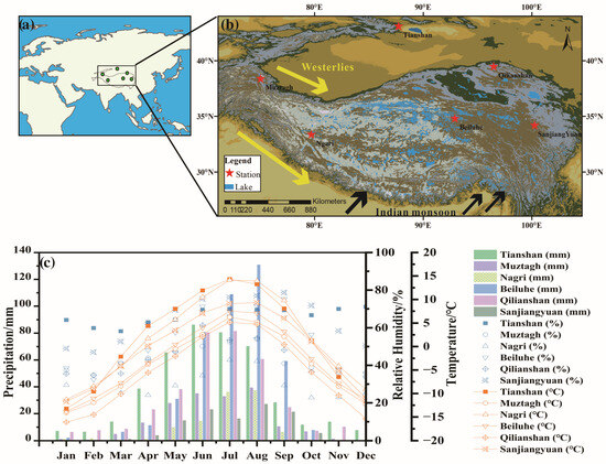 Map showing locations of the sampling station in central Asia and the Tibetan Plateau (a,b). Monthly variations of precipitation amount, air temperature, and relative humidity at TS, MZTG, Nagri, BLH, and QLS stations during 2014–2020 (c).