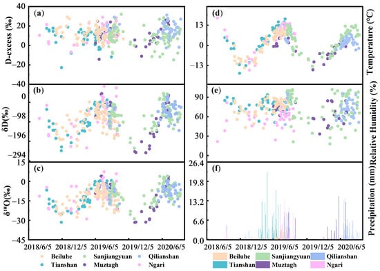 Variations of precipitation δ18O (a); δD (b); d-excess (c); surface air temperature (d); relative humidity (e); precipitation amount (f) in each precipitation event during the sampling period (August 2018 to September 2020) for 6 sampling sites over the north Tibetan Plateau. The colors mark the different sampling sites.