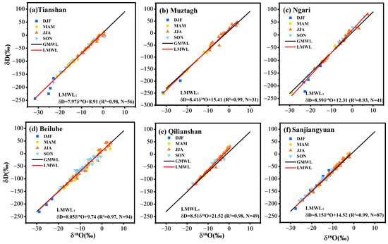 Compared with GMWL, the slope and intercept of LMWL in TS are slightly lower than those of GMWL, while the slope of LMWL in BLH and SJY are close to that of the GMWL, but the intercepts are significantly different (BLH: 9.74, SJY: 14.52). The TS exhibits a lower slope and intercept, while the MZTG, NL, and SJY demonstrate greater values than the GMWL. The decreased slope suggests that precipitation in TS may have undergone more sub-cloud evaporation of raindrops. In contrast, the higher altitude and lower temperatures at the other stations promote a weaker effect of sub-cloud evaporation, potentially contributing to their higher slope and intercept values, which could be attributed to moisture sources and local recycling. Nevertheless, the LMWL obtained from annual data does not capture the variation across different seasons due to seasonal changes in moisture sources, transport patterns, and local meteorological conditions. Therefore, we analyzed the seasonal variability of the precipitation line equation at different stations.