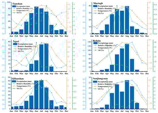 Monthly variations of precipitation Δd (‰), surface air temperature (°C), relative humidity (%), and precipitation amount (mm) for 6 sampling sites over the north Tibetan Plateau.