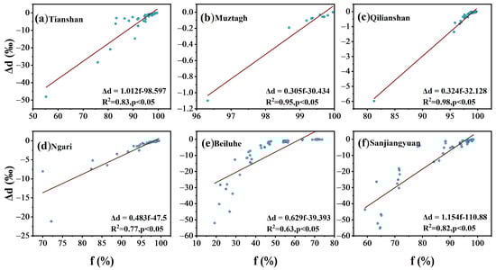 The relationships between f and Δd at six stations in the NTP are depicted in Figure 5, demonstrating a notable correlation. The correlation coefficients between f and Δd from May to September at NL and MZTG, which are relatively dry, are less than 1, indicating that a 1% increase in f results in Δd increases by 0.48‰ and 0.31‰, respectively. QLS and BLH are situated at an altitude exceeding 4000 m, and the average temperature from May to September does not exceed 8 °C. The correlation coefficients between f and Δd are also less than 1, with a 1% increase in f leading to Δd increasing by 0.33‰ and 0.63‰, respectively. Under the most humid environmental conditions in TS and SJY, the correlation coefficients between f and Δd are close to 1‰/1%, which is consistent with the European Alps [72], the TS Mountains, and the Hexi Corridor [98]. Our study indicates that the linear relationship between f and Δd is stronger under environmental conditions of relatively high humidity, high precipitation, and low temperature. However, the linear relationship of 1‰/1% between f and Δd is not universally applicable in cold and dry regions, potentially being significantly lower than this empirical relationship value in reality.