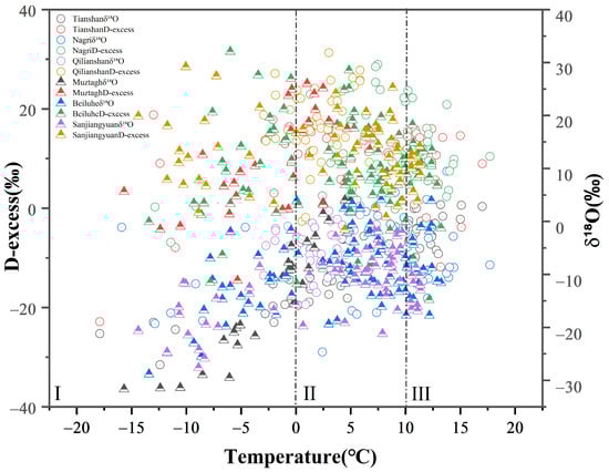 Plot of temperature versus δ18O and d-excess at sampling sites over the north Tibetan Plateau in different temperature ranges (below 0 °C, from 0 to 10 °C, and above 10 °C).